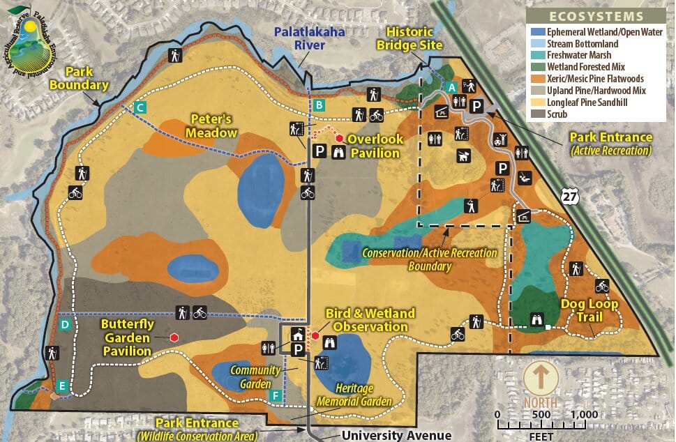 PEAR Park is more Old Florida woods and wetlands than βriver walkβ β think shaded dirt trails, wooden bridges, and quiet stretches where youβll barely see another person. The Palatlakaha (say that 5 times fast!) system runs through here, but itβs mostly tucked into the landscape, not wide open water. Itβs flat, peaceful, and just wild enough to feel like a reset.