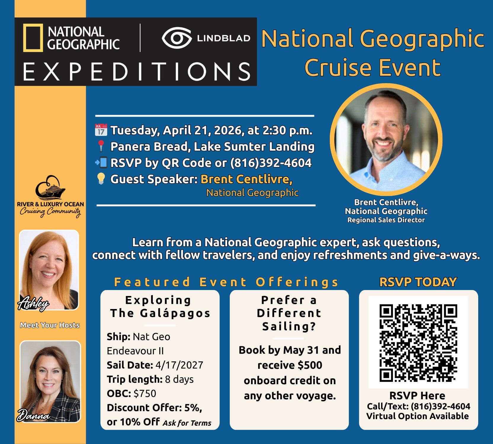 Join National Geographic's Brent Centlivre at Panera Bread in Lake Sumter Landing on Tuesday, April 21 at 2:30pm β and get the inside scoop on 8 days exploring the GalΓ‘pagos by land and sea, encountering giant tortoises, penguins, and sea lions aboard a National Geographic expedition ship. Book by May 31, save 5%, and pocket a $750 onboard credit β tap the image to RSVP! π